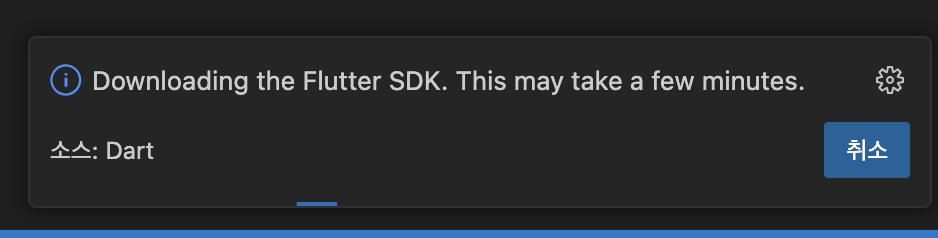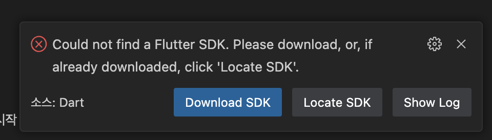 그러면 오른쪽 하단에 Flutter SDK를 찾을수 없으니 다운로드를 받거나 이미 다운로드가 되어있다면 SDK의 위치를 임의 설정 해달라라는 문구 노출